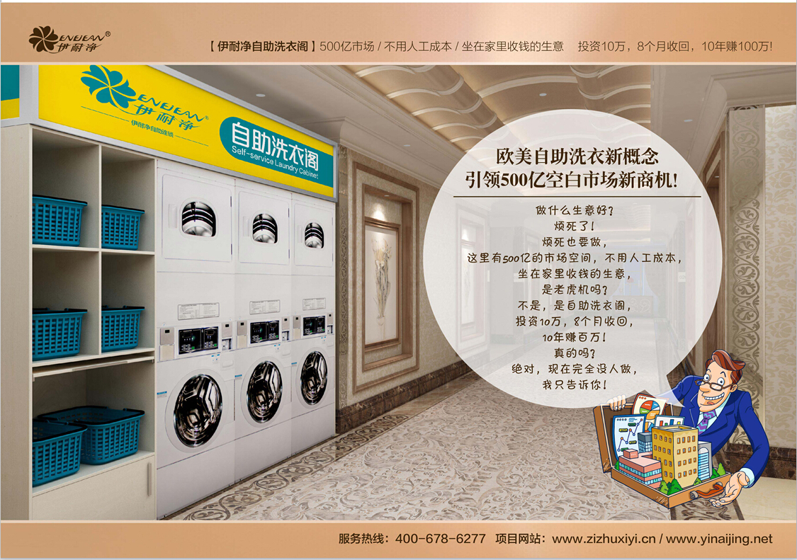 的這些其實只是我們自助洗衣閣的一小部分優勢,多的東西現電話上也很難去說清楚。我們在廣州設有自助洗衣閣的樣板店,現在經營的非常好,我們準備在其它城市也做些樣板店的投放。您也知道從季節上來說,天氣冷,我們洗衣行業的生意也會,而現在剛好是秋天,各地也慢慢變冷了,是投資好的季節,也是打開市場好的時候。在明年春天的時候您就可以完回本,經營的好今年年就能回本,那么明年,后年,或者以后,他就成了一個比收房租還舒服的一個項目了。